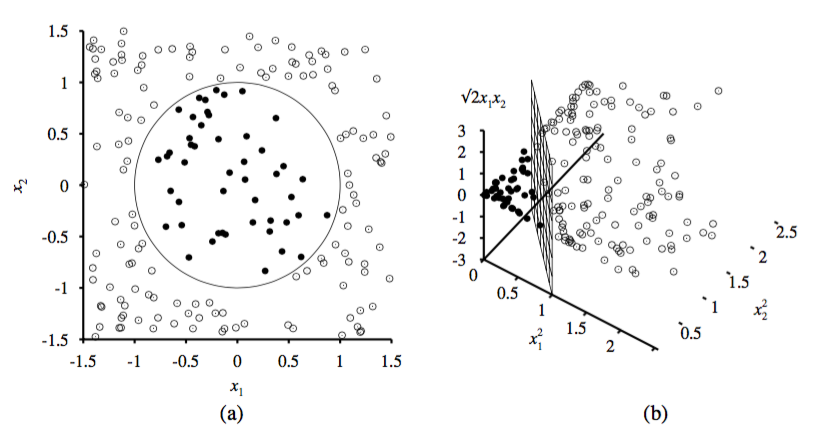 Abbildung 4: Kernel Trick grafisch dargestellt: (a) Daten im zweidimensionalen Raum, (b) Daten projiziert in den dreidimensionalen Raum[7]