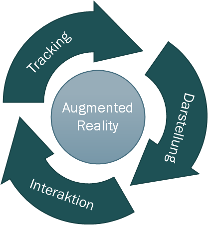 Dieser Abschnitt bringt die zuvor erläuterten Technologien in eine konzeptionelle Übersicht. Das hier vorgestellte Konzept kann als Framework zur Entwicklung von Architekturen für AR-Systeme dienen und wird als AR-Basis-Zyklus bezeichnet. Die Abbildung 2 veranschaulicht die notwendigen Herausforderungen, um ein AR-System zu realisieren. Hierbei greifen die drei dargestellten Basis-Elemente in einem sich wiederholenden Zyklus ineinander. Das Tracking bestimmt die für die Darstellung notwendigen Positionen von virtuellen Inhalten. Während diese Prozesse erfolgen, kann sich der Kontext für die virtuellen Inhalte durch eine Interaktion verändern. Diese Interaktion hat unmittelbaren Einfluss auf die Umgebung des AR-Systems und erfordert ein kontinuierliches Tracking.