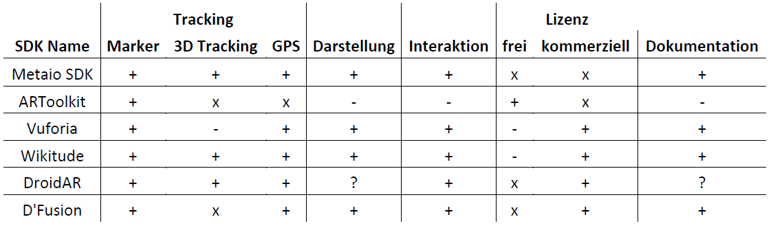 Zur Umsetzung dieses Konzepts stehen frei verfügbare sowie kommerzielle Werkzeuge zur Verfügung. Die folgende Übersicht stellt einige bekannte AR Software Development Kits (SDK) in Relation zu folgenden Aspekten: