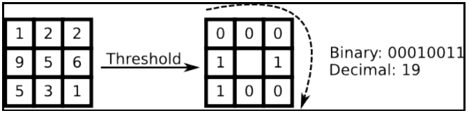 Die erste Variante (siehe folgende Abbildung links) und die übliche Standardvariante ist es, dass man den Intensitätwert eines Mittelpunktes als Basis nimmt und anschließend für alle Nachbarpixel einen Wert zwischen 0 und 1 festlegt. 1 ist es dann, wenn der Nachbarpunkt größer ist als der Wert des Mittelpunktes. 0 dann, wenn es kleiner oder gleich ist.[1.6]