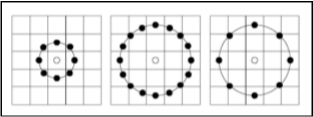 Die zweite Variante ist ähnlich wie die Erste. Mit dem Unterschied, dass hier statt den direkten Nachbarn die einen weiter außen liegenden Nachbarn verwendet werden (siehe Mitte der folgenden Abbildung). Dann hat man 8 statt 16 Nachbarn und daraus ergibt sich der Name LBP 16,2.[1.6]