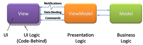 Das ViewModel dient als Bindeglied zwischen View und Model, wobei das ViewModel die View nicht kennt. Es stellt der View öffentliche Methoden und Eigenschaften zur Verfügung, über die die View Daten holen kann und Ereignisse in der View weiter an das ViewModel gibt. Das ViewModel wiederum ruft Methoden und Elemente des Models aus um Informationen auszutauschen.