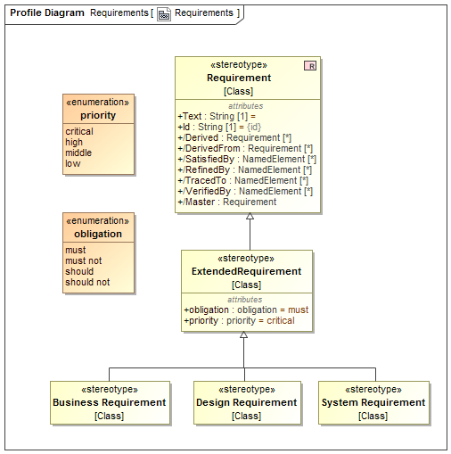 Ein Stereotyp kann von anderen Stereotypen mit Hilfe einer „Generalisierung“ spezialisiert werden. In Abbildung 7 ist der Stereotyp „Requirement“ von der Metaklasse Class erweitert worden. Der Stereotyp besitzt zusätzliche Eigenschaften wie z.B. Id und Text. Von „Requirement“ wurde ein spezialisierter Stereotyp „ExtendedRequirement“ erzeugt, der alle Eigenschaften von „Requirement“ besitzt und zusätzlich die Attribute obligation und priority enthält. Für die bessere Differenzierung von Anforderungen wurden von „ExtendedRequirement“ die drei Anforderungstypen „Business Requirement“, „System Requirement“ und „Design Requirement“ abgeleitet.