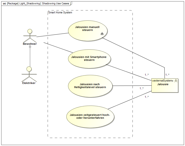 In Abbildung 6 wird die konkrete Anwendung eines externalSystems in einem Use-Case-Diagramm gezeigt. Das Diagramm zeigt Use-Cases für ein Smart Home System. In dem Use-Case „Jalousien mit Smartphone steuern“ ist der Akteur „Bewohner“ und das externalSystem „Jalousie“ beteiligt.