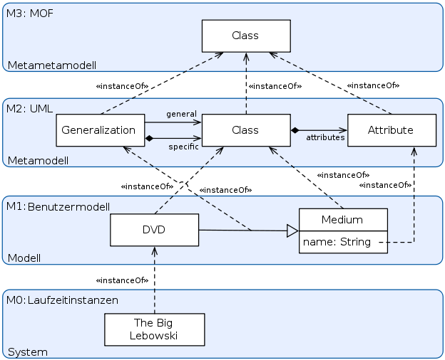 Abbildung 4 zeigt beispielhaft den Zusammenhang der verschiedenen Ebenen der (Meta-)Modelle anhand der UML.