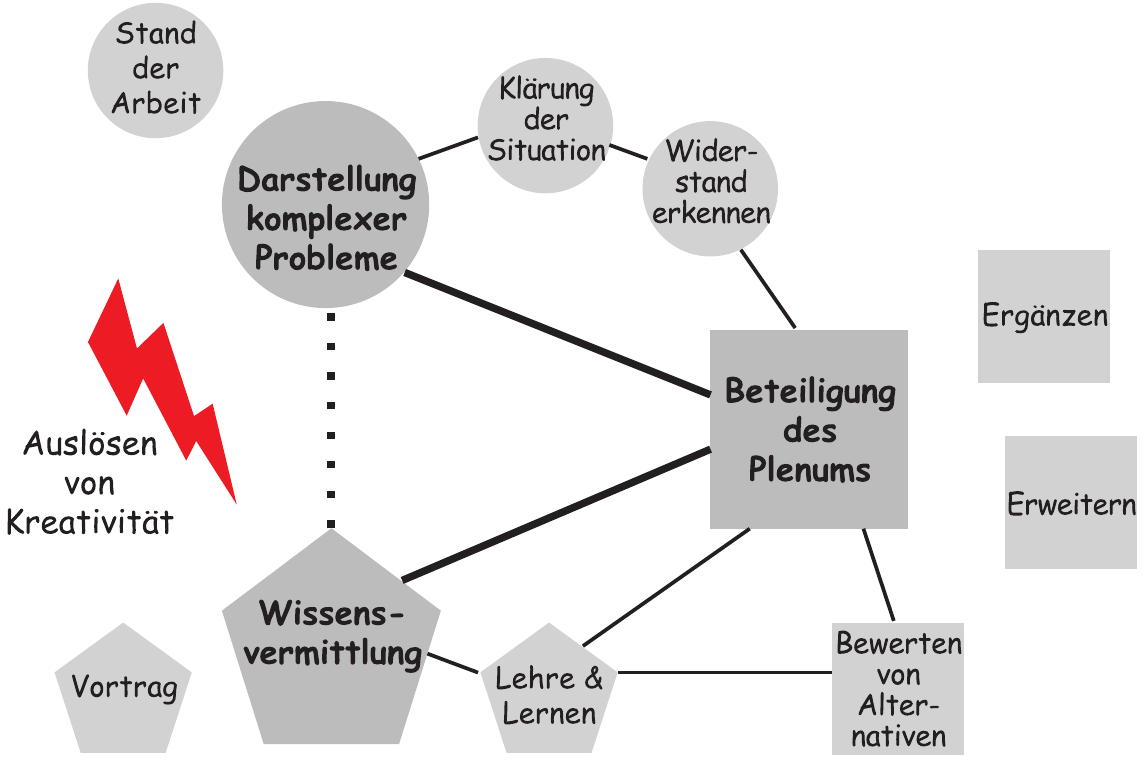 Man setzt dabei auf folgende vier Grundelemente beim Arbeiten auf einer Metaplanwand, einem Flipchart oder Whiteboard: die Liste, die Tabelle, der Baum und das Netz.